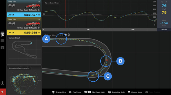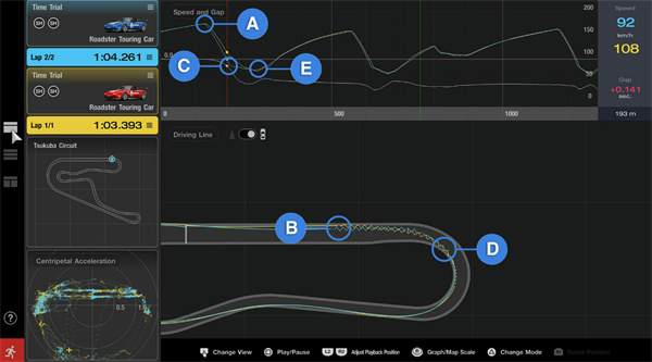 就像现实世界里的赛车比赛一样,数据记录仪会把玩家的驾驶数据输出为一组非常直观的图表,以便随时回顾和分析得失。比如可以通过比较两次驾驶的“速度与时间差”和“行车线”图表, 来分析每一个弯道的失误情况,抑或是刹车方面的失误。