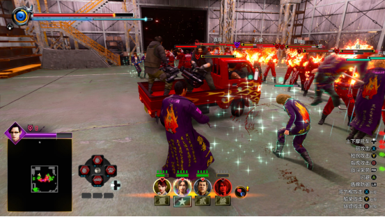 攻坚战是桐生带领亲卫队和其他三队人马,骑着摩托车攻占敌方仓库和据点,四条路线全部占领后就可以进行大混战;歼灭战则是一开始就是大混战,看着几十人打来打去的大场面还是非常爽的,而且《极3》的动作系统有很多范围伤害招式,直接一招抡番七八个人都不在话下。