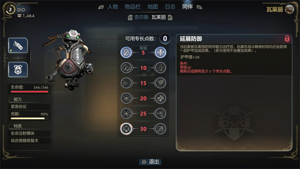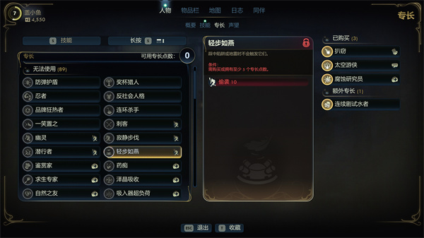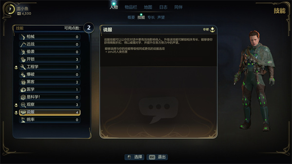 技能共有12类,初始只能选三个,过了序章之后就可以自由加点了,不过随着剧情的推进,需要的技能等级也就会越来越高,比如最开始1点说服就能完成某个任务的交接,但是过了几级之后,你再去和另一个支线角色交谈,劝她放弃某种选择,这一大段的谈话中需要的说服等级不断提升,从1点逐渐加码到3点,才能判定成功。